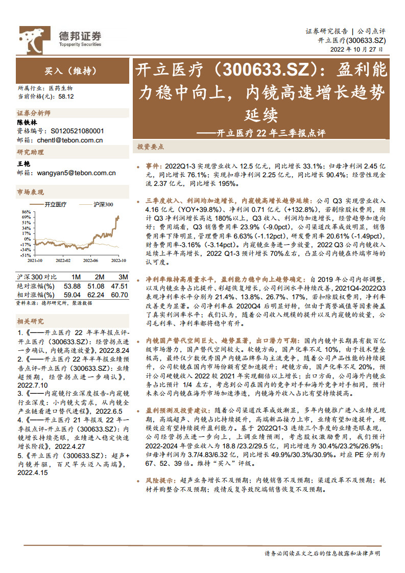 随着渠道改革成效显现、内镜业务进入业绩兑现期、高端超声和内镜占比提升以及高端新品上市,公司业绩有望加速增长,规模效应将持续提升盈利能力。基于2022年前三季度的亮眼表现,德邦研究所上调业绩预测,预计2022-2024年营业收入分别为18.8亿元、23.2亿元、29.5亿元,同比增速分别为30.4%、23.2%、26.9%;归母净利润分别为3.7亿元、4.83亿元、6.32亿元,同比增长49.9%、30.3%、30.9%。对应PE分别为67、52、39倍。维持“买入”评级。