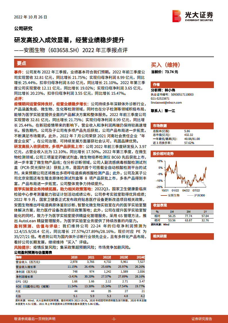 光大证券研究所维持了安图生物2022-2024年的归母净利润预测,分别为12.4亿元、15.9亿元和20.4亿元,同比增长率分别为27.57%、27.89%和28.16%。基于当前股价,对应的市盈率(PE)分别为35倍、27倍和21倍。考虑到公司作为国内体外诊断行业的领先企业,拥有多样化的产品布局,分析师看好公司长期发展,并继续维持“买入”评级。报告同时提示了疫情反复、集采政策超预期以及市场竞争加剧等风险。