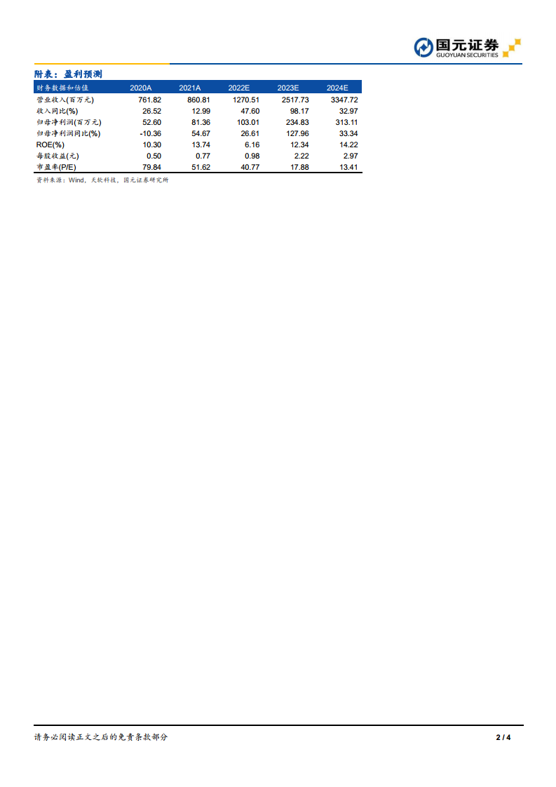 自2021年年中以来,华康医疗在手订单持续维持高位。截至2022年上半年,在手订单增至15.52亿元;截至2022年9月末,在手订单进一步提升至17.35亿元,其中医疗净化系统集成业务订单达14.61亿元。充足的在手订单为公司业绩增长提供了有力保障。考虑到近期全国疫情多点散发可能对公司施工进度带来影响,分析师调整了盈利预测。预计公司2022年至2024年营业收入分别为12.71亿元、25.18亿元和33.48亿元,同比增速分别为47.60%、98.17%和32.97%。归属于母公司股东的净利润预计分别为1.03亿元、2.35亿元和3.13亿元,同比增速分别为26.61%、127.96%和33.34%。对应的每股收益(EPS)分别为0.98元、2.22元和2.97元,市盈率(PE)分别为40.77倍、17.88倍和13.41倍。基于上述分析,分析师维持对华康医疗的“买入”评级。