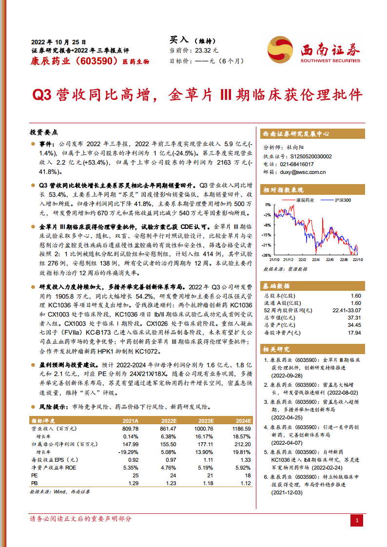 康辰药业(603590):Q3营收同比高增,金草片III期临床获伦理批件
