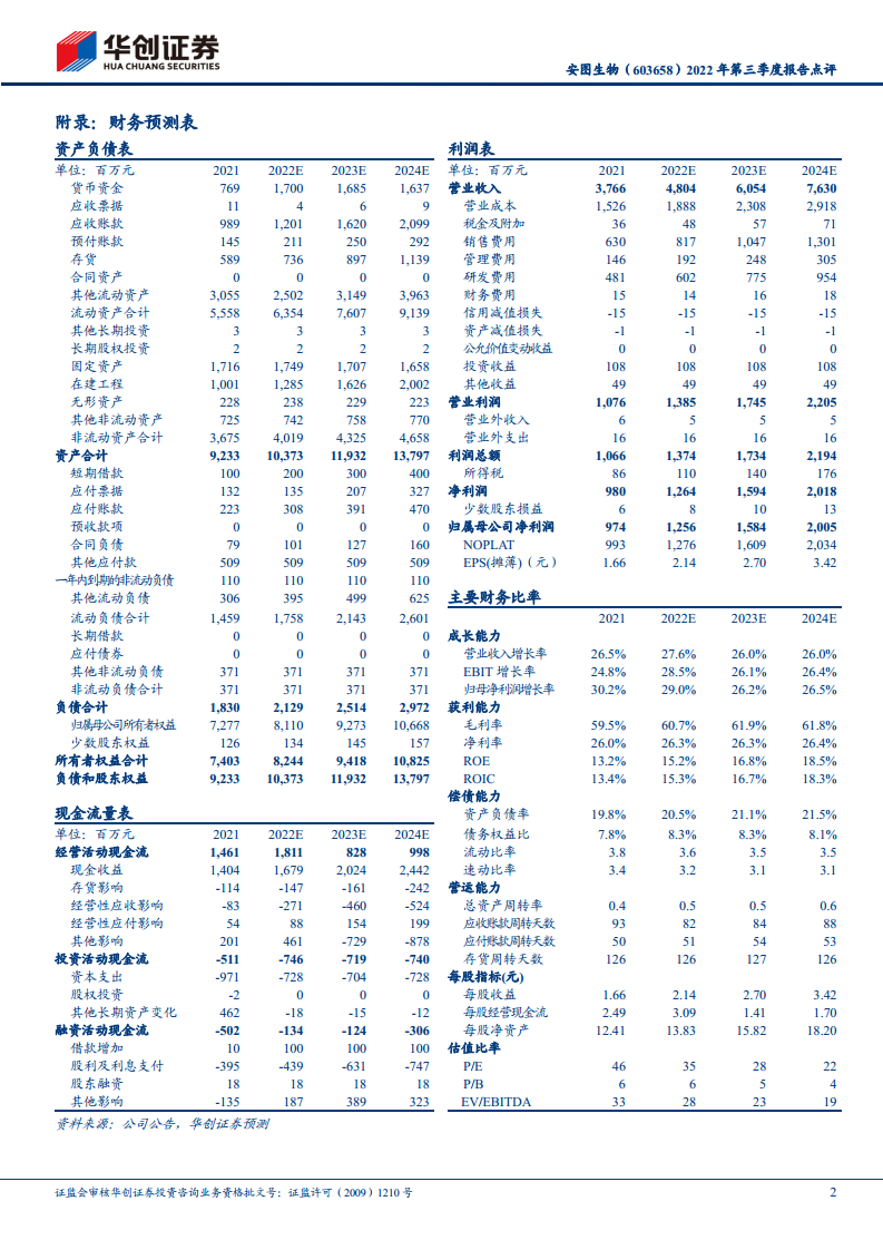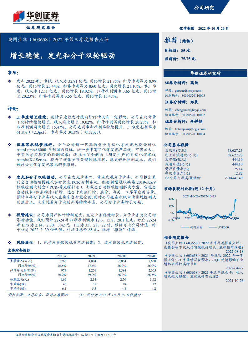 华创证券维持对安图生物的“推荐”评级,目标价85元。预计公司2022-2024年归母净利润分别为12.6亿元、15.8亿元、20.1亿元,对应EPS分别为2.14元、2.70元、3.42元,PE分别为35倍、28倍、22倍。基于可比公司估值,给予公司2022年39倍估值。