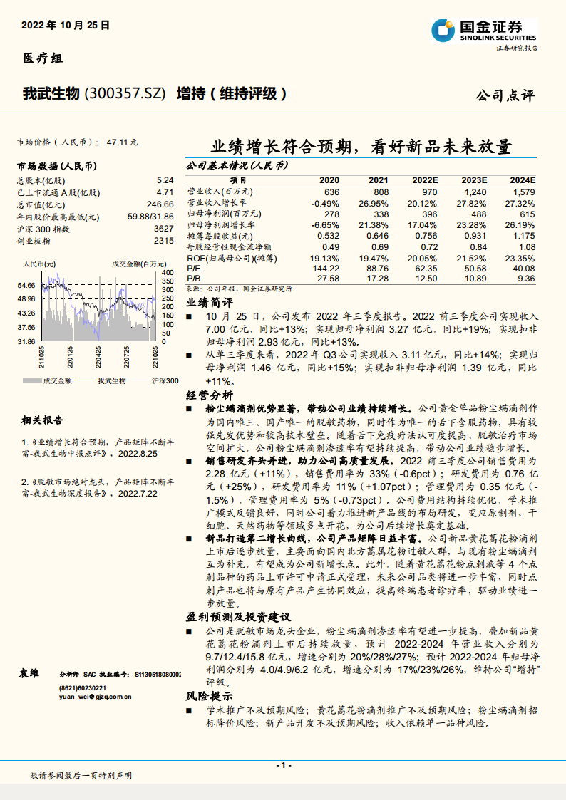 我武生物在2022年前三季度表现出稳健的业绩增长,核心产品粉尘螨滴剂的市场优势持续巩固。公司通过优化费用结构、加大研发投入,并积极拓展黄花蒿花粉滴剂等新产品线,构建了多元化的增长引擎。尽管存在市场推广和产品开发等风险,但鉴于其在脱敏市场的龙头地位和清晰的产品发展战略,公司未来业绩增长潜力可期,维持“增持”评级。