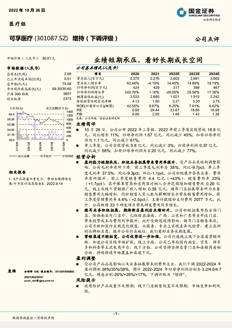 可孚医疗(301087):业绩短期承压,看好长期成长空间