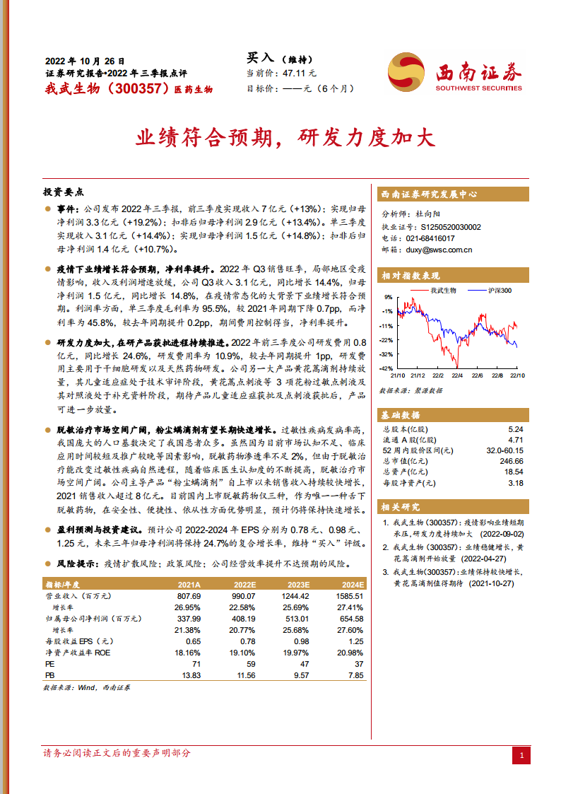我武生物在2022年前三季度展现出稳健的业绩增长,营收和净利润均符合市场预期,尤其在疫情影响下仍能保持净利率提升,显示出良好的经营韧性。公司持续加大研发投入,推动在研产品线进展,为未来增长奠定基础。鉴于国内脱敏治疗市场的巨大潜力以及公司核心产品“粉尘螨滴剂”的独特竞争优势,我武生物有望实现长期快速发展。分析师维持“买入”评级,并预计公司未来三年净利润将保持约25%的复合增长率。投资者需关注疫情、政策及经营效率等潜在风险。