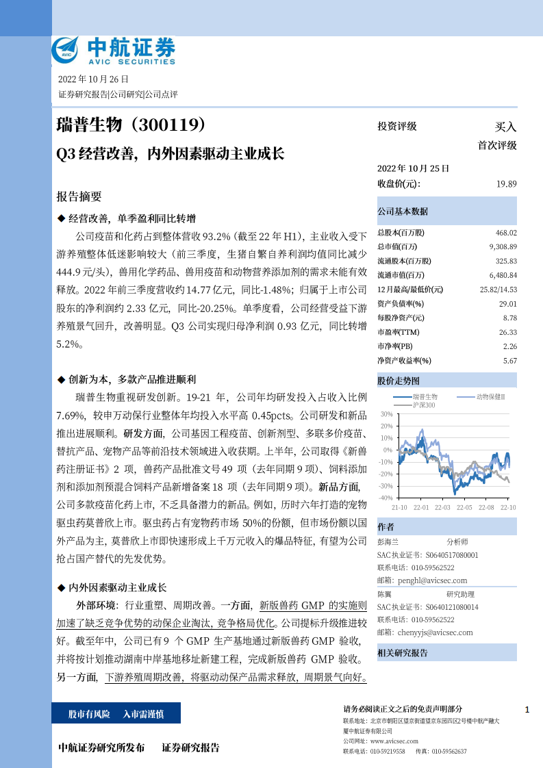 瑞普生物(300119):Q3经营改善,内外因素驱动主业成长