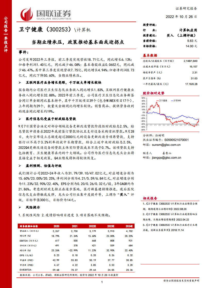 分析师预计公司2022-2024年收入分别为31.79/39.10/47.02亿元,对应增速分别为15.60%/23.00%/20.25%;净利润分别为4.21/5.59/6.84亿元,对应增速分别为11.23%/32.90%/22.40%,三年复合增长率约为21.86%。考虑到财政支持逐步落地、医疗新基建持续推进、疫后医院信息化支出触底反弹以及龙头公司行业集中度提升等因素,分析师上调公司评级为“买入”,目标市值300亿元,目标价为14元。