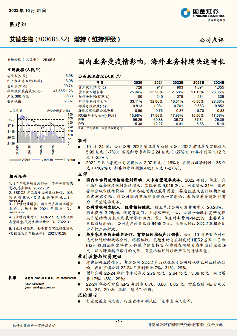 艾德生物(300685):国内业务受疫情影响,海外业务持续快速增长