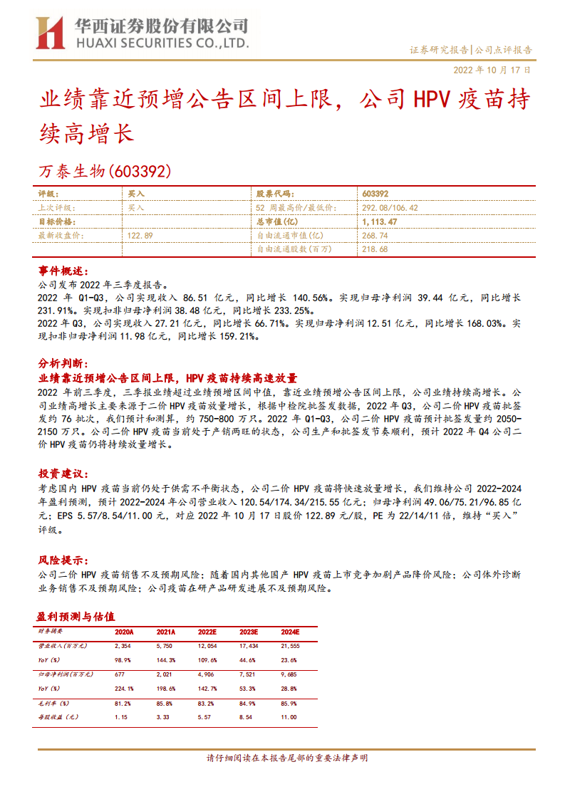 万泰生物(603392):业绩靠近预增公告区间上限,公司HPV疫苗持续高增长