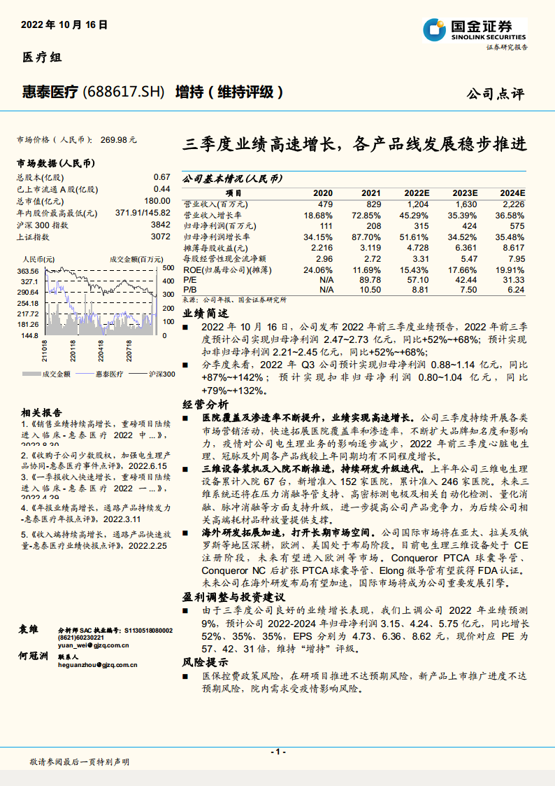 惠泰医疗(688617):三季度业绩高速增长,各产品线发展稳步推进
