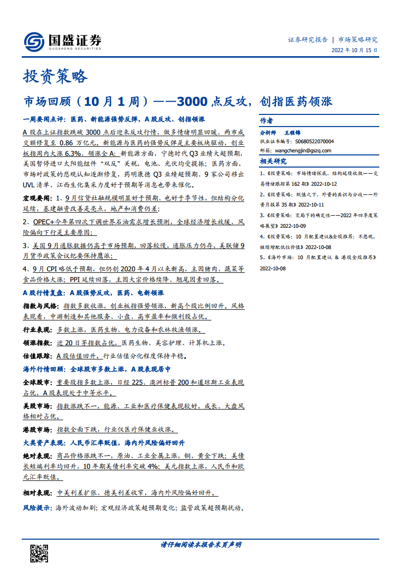 3000点反攻,创指医药领涨:市场回顾(10月1周)