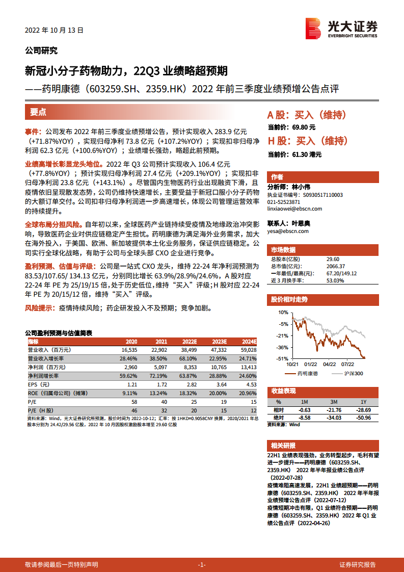 药明康德(603259):新冠小分子药物助力,22Q3业绩略超预期