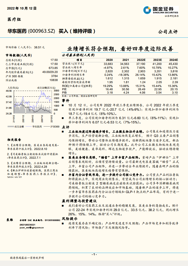 华东医药(000963):业绩增长符合预期,看好四季度边际改善