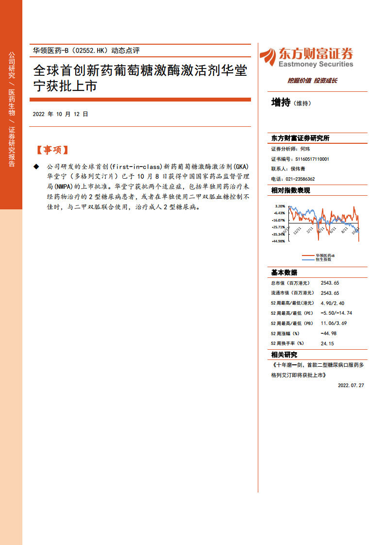 华领医药-B(02552):全球首创新药葡萄糖激酶激活剂华堂宁获批上市