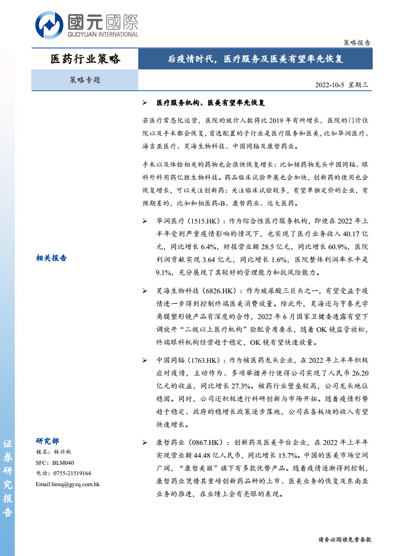 医药行业策略:后疫情时代,医疗服务及医美有望率先恢复