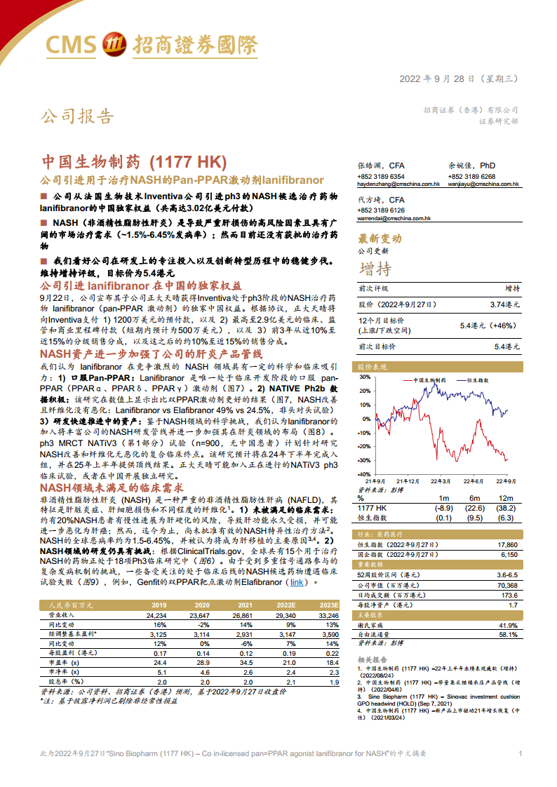 中国生物制药(01177):公司引进用于治疗NASH的Pan-PPAR激动剂lanifibranor