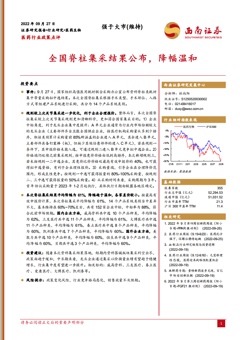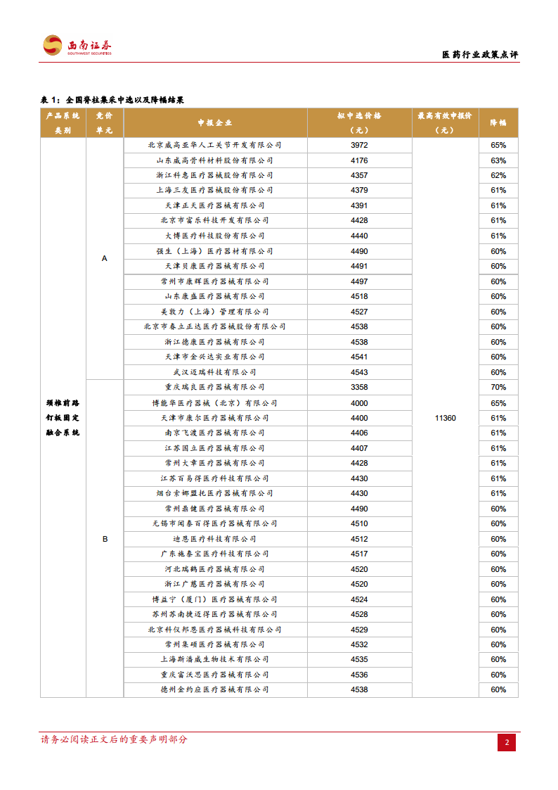 医药行业政策点评:全国脊柱集采结果公布,降幅温和