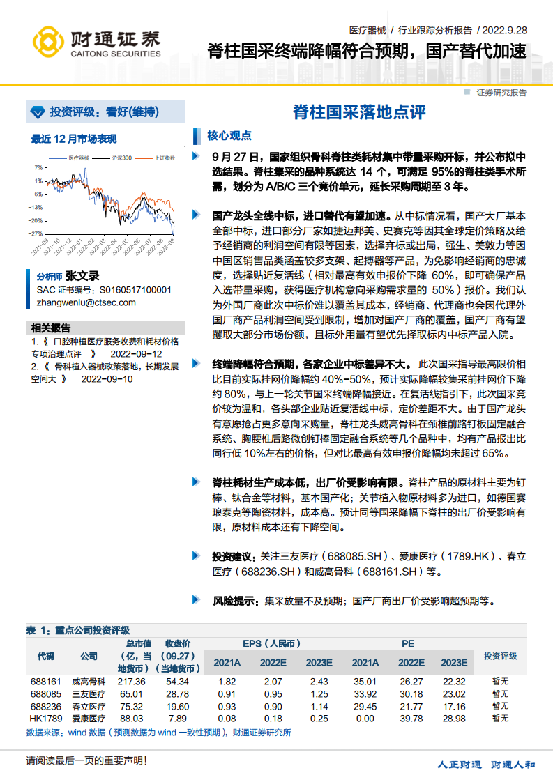 医疗器械行业跟踪分析报告:脊柱国采终端降幅符合预期,国产替代加速