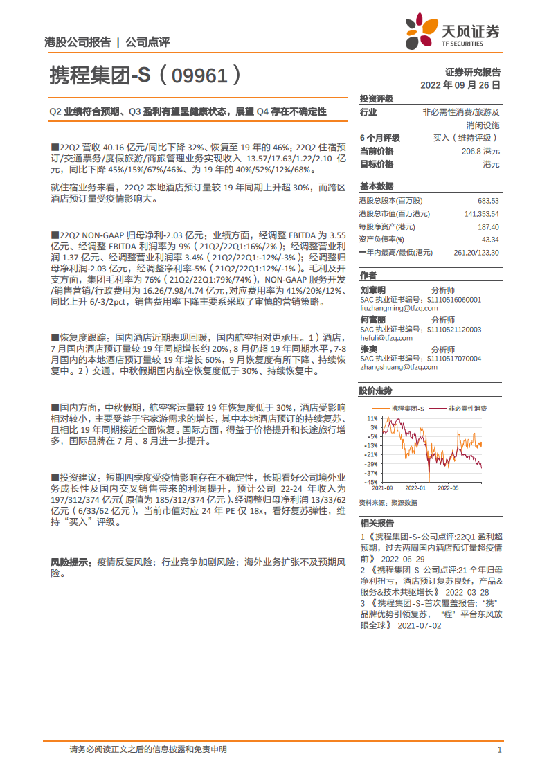 携程集团-S(09961):Q2业绩符合预期、Q3盈利有望呈健康状态,展望Q4存在不确定性