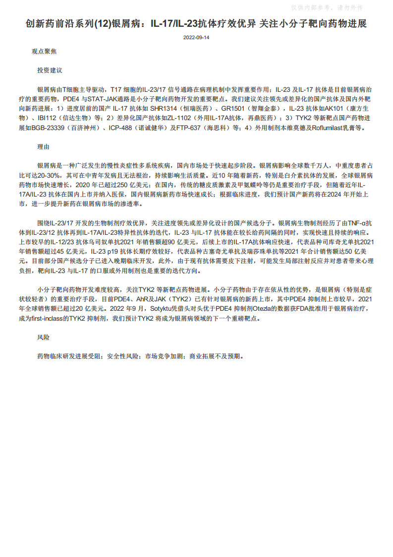 医药行业-创新药前沿系列(12)银屑病:IL-17/IL-23抗体疗效优异,关注小分子靶向药物进展