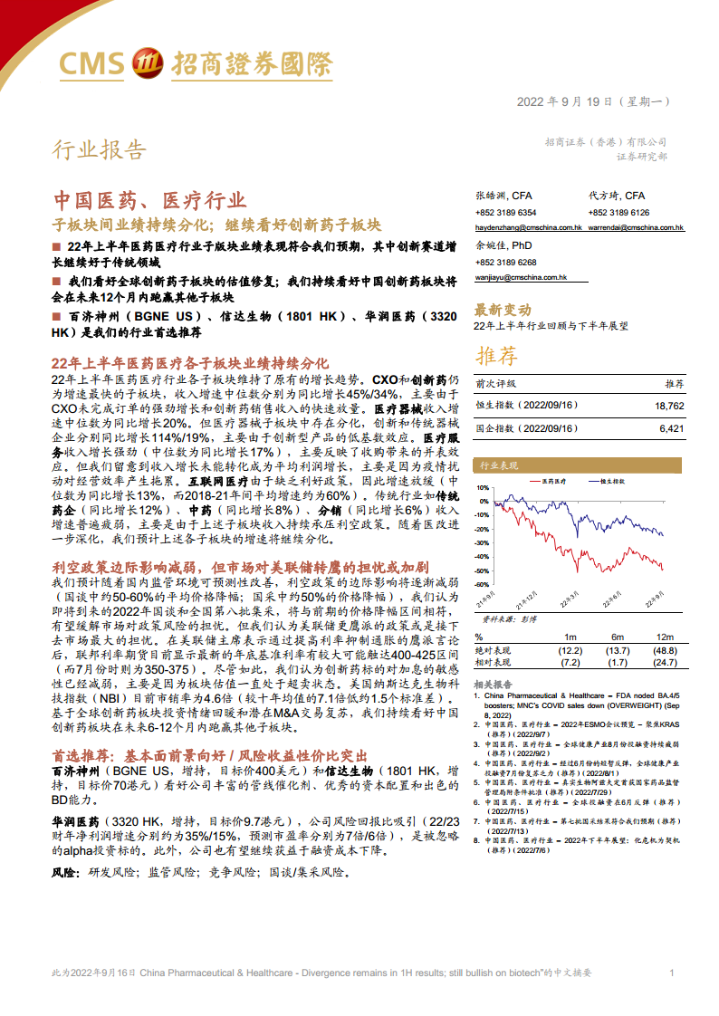 中国医药、医疗行业:子板块间业绩持续分化;继续看好创新药子板块