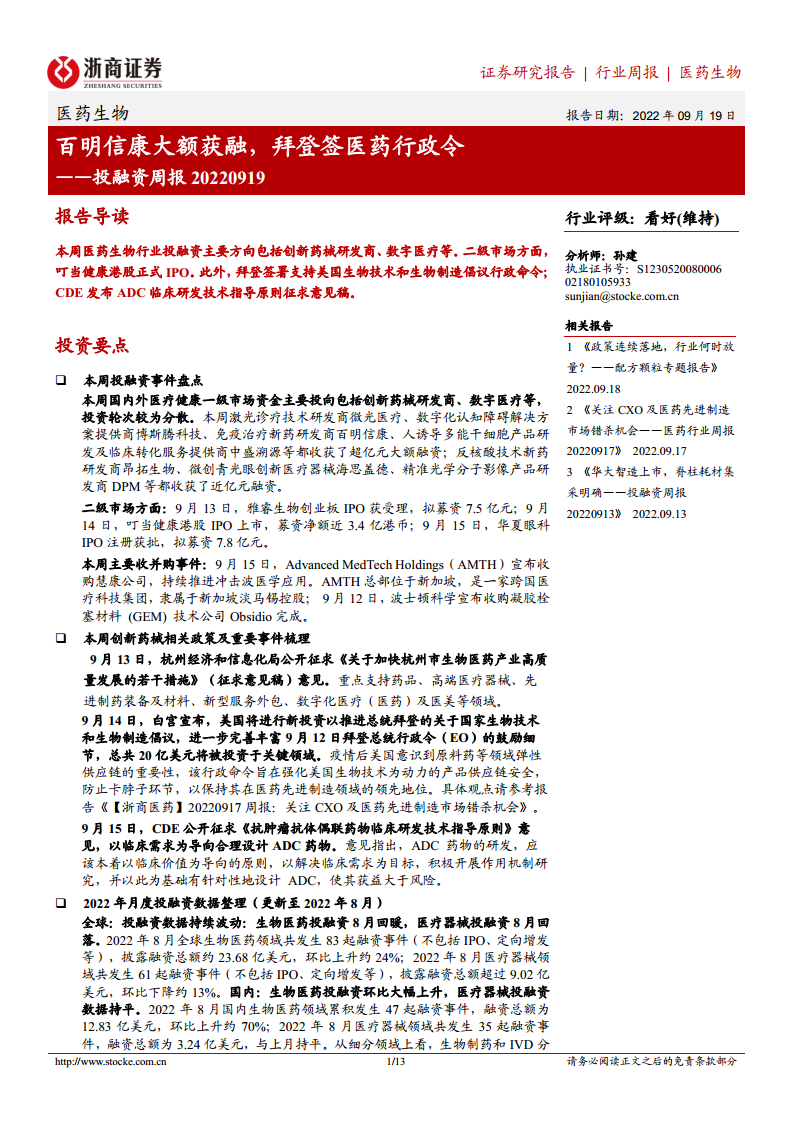 医药生物投融资周报:百明信康大额获融,拜登签医药行政令