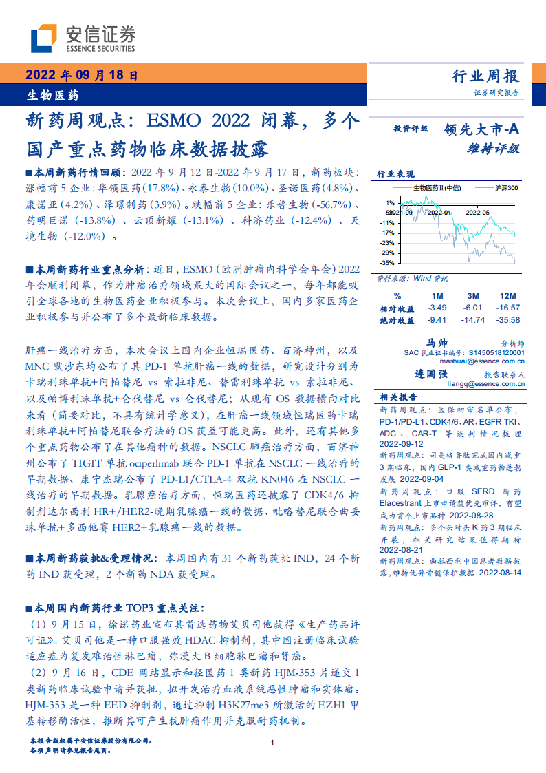 生物医药新药周观点:ESMO 2022闭幕,多个国产重点药物临床数据披露