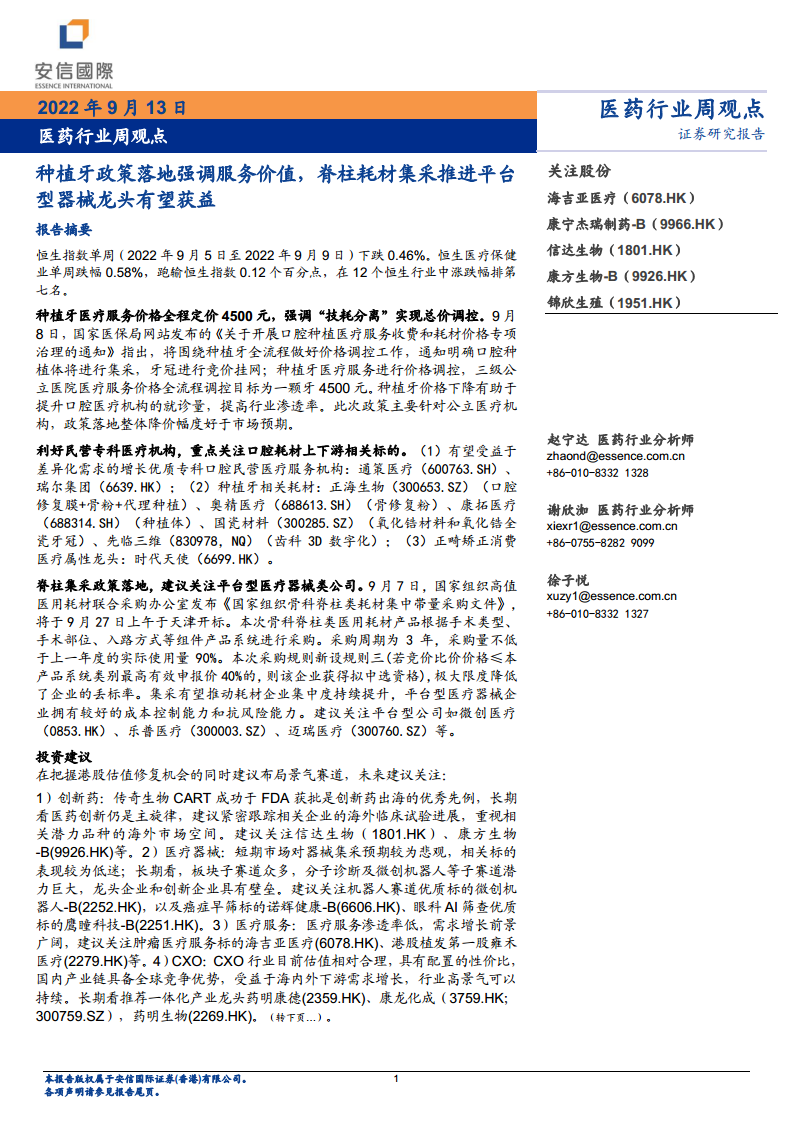 海吉亚医疗(06078):种植牙政策落地强调服务价值,脊柱耗材集采推进平台型器械龙头有望获益