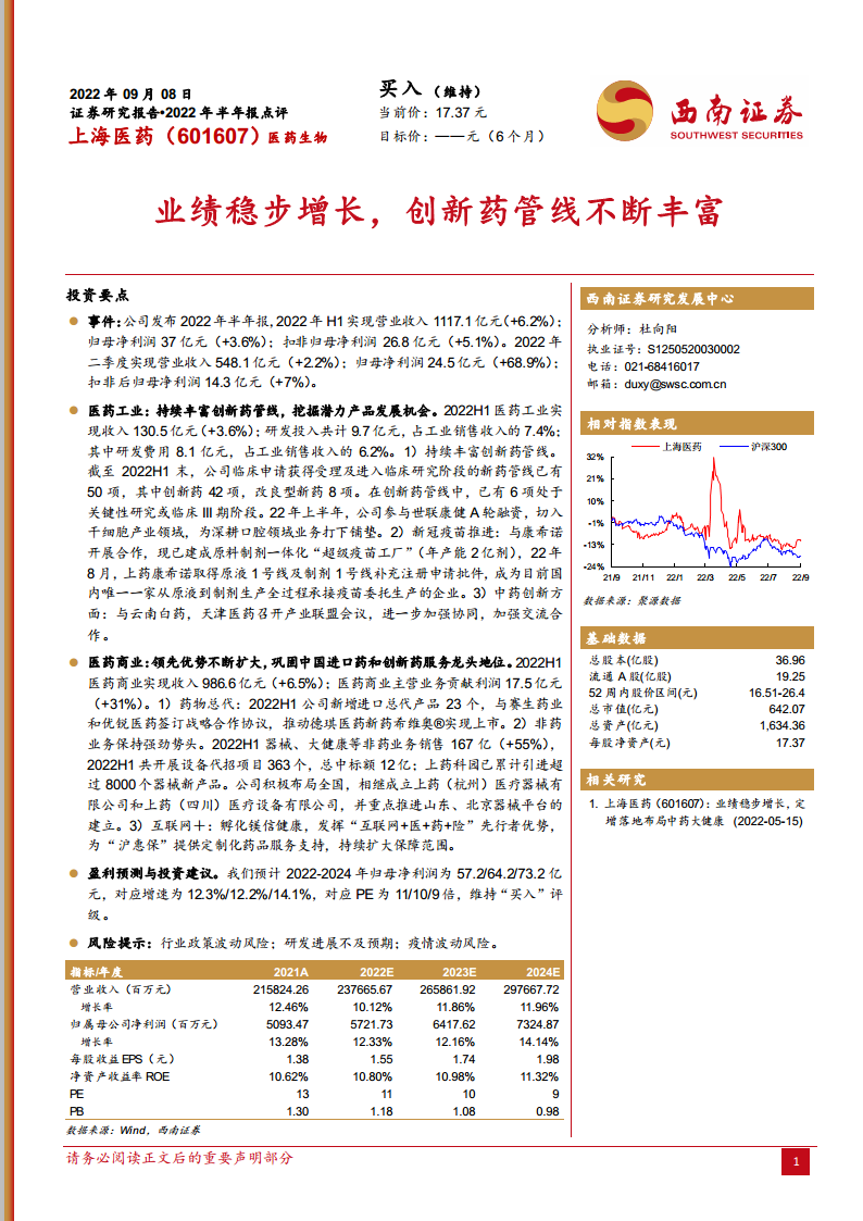 上海医药(601607):业绩稳步增长,创新药管线不断丰富