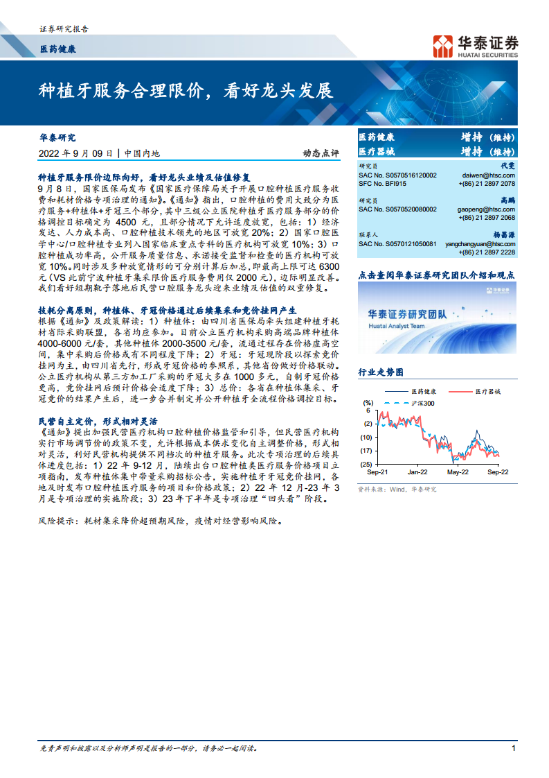 医药健康动态点评:种植牙服务合理限价,看好龙头发展