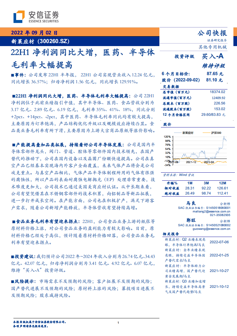 22H1净利润同比大增,医药、半导体毛利率大幅提高