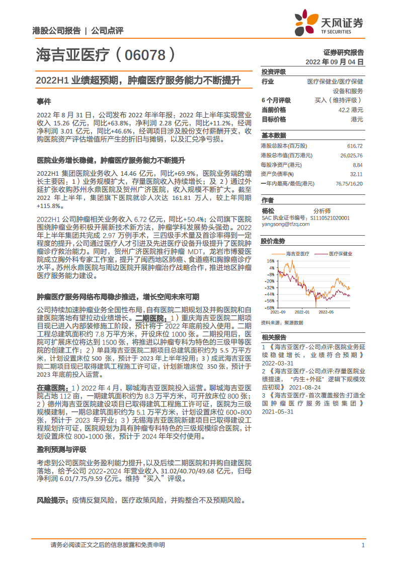 海吉亚医疗(06078):2022H1业绩超预期,肿瘤医疗服务能力不断提升