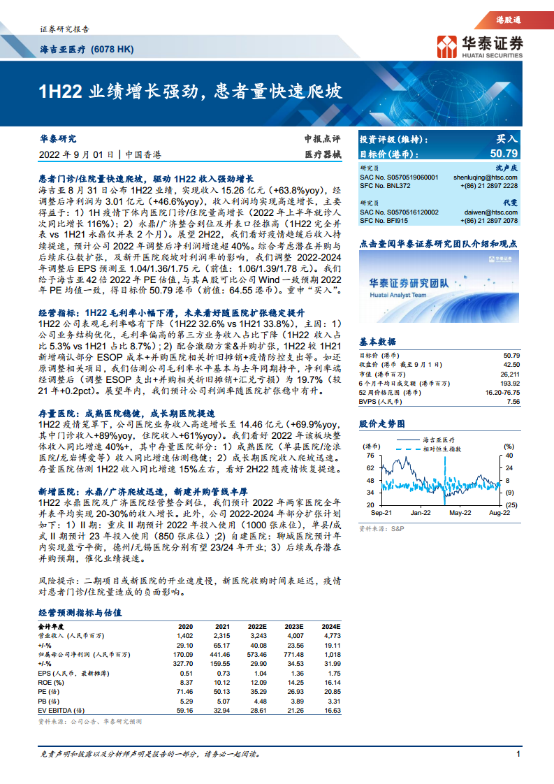 海吉亚医疗(06078):1H22业绩增长强劲,患者量快速爬坡