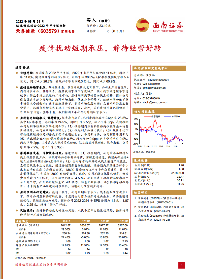荣泰健康(603579):疫情扰动短期承压,静待经营好转