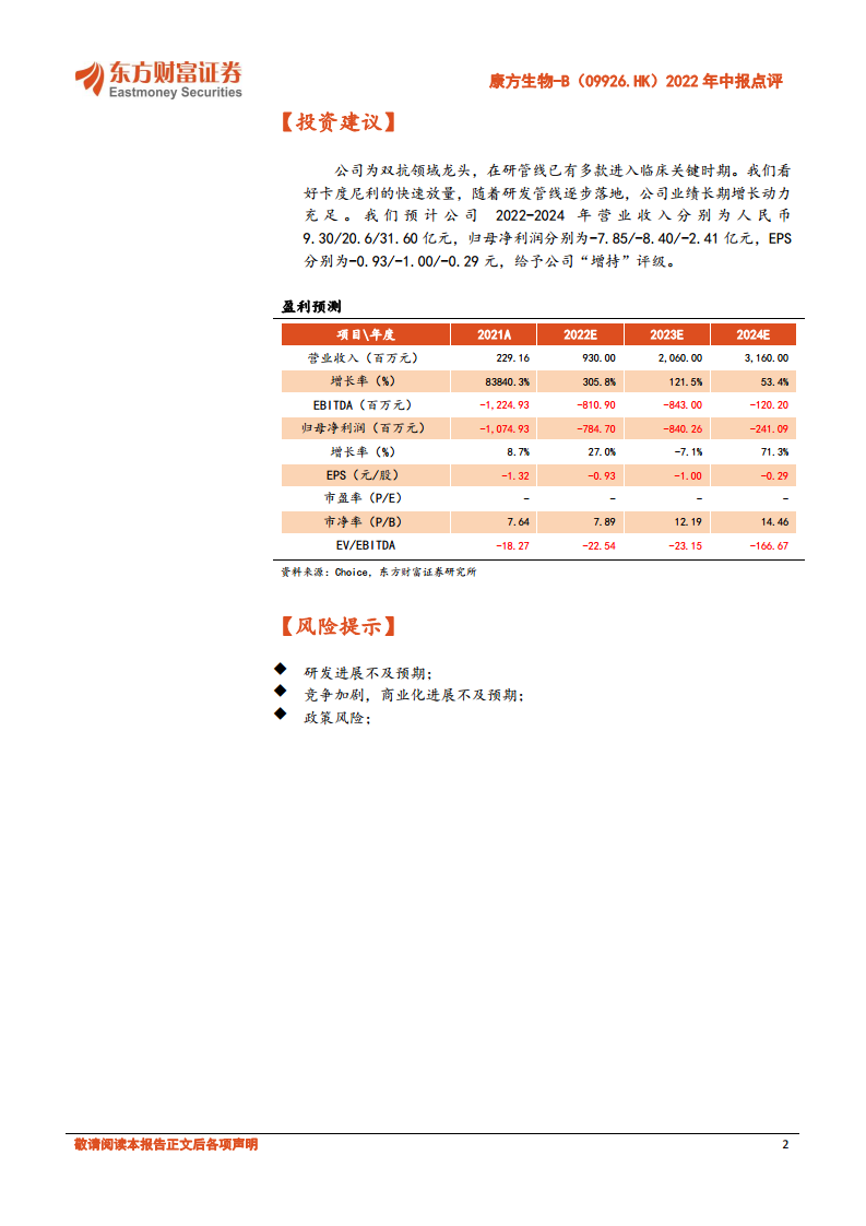 康方生物-B(09926)2022年中报点评:卡度尼利单抗商业化进展顺利,产品管线临床研究进展值得期待