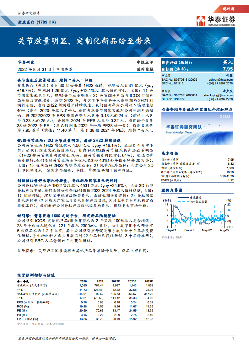 爱康医疗(01789):关节放量明显,定制化新品纷至沓来