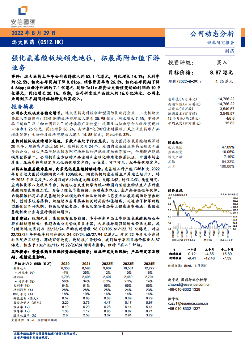 远大医药(00512):强化氨基酸板块领先地位,拓展高附加值下游业务