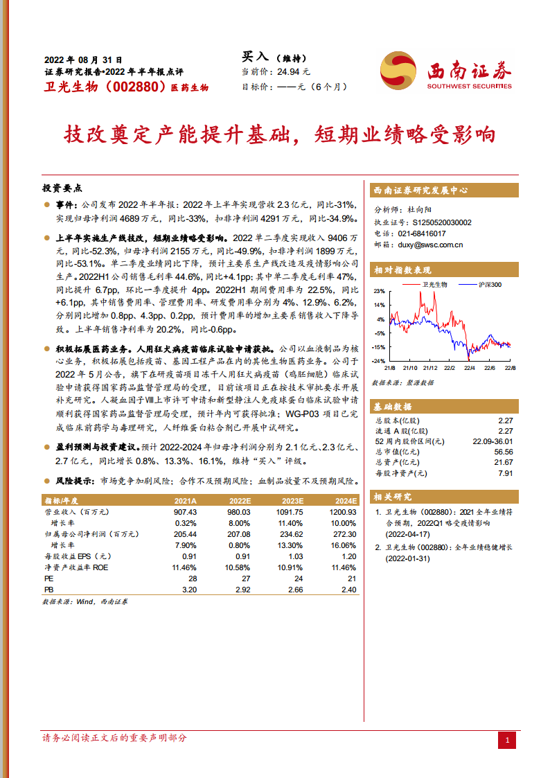 卫光生物(002880):技改奠定产能提升基础,短期业绩略受影响