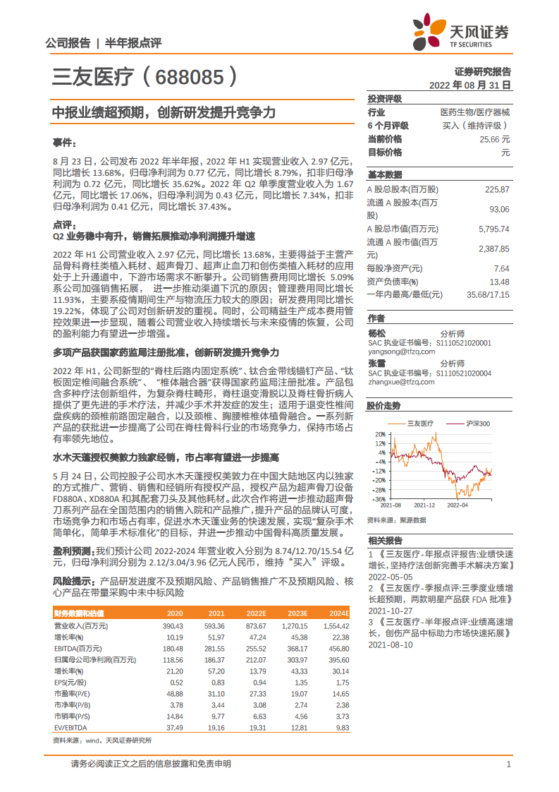 三友医疗(688085):中报业绩超预期,创新研发提升竞争力
