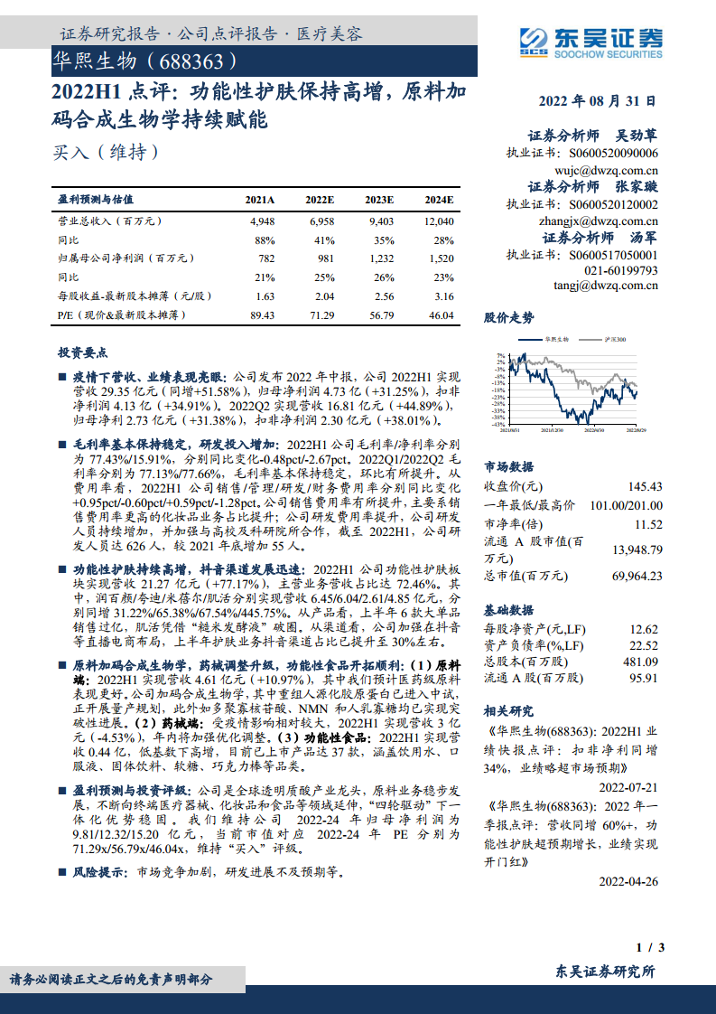 2022H1点评:功能性护肤保持高增,原料加码合成生物学持续赋能