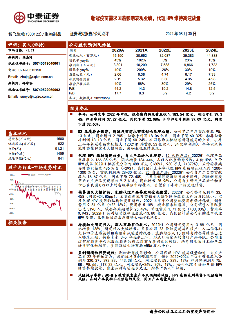 智飞生物(300122):新冠疫苗需求回落影响表观业绩,代理HPV维持高速放量