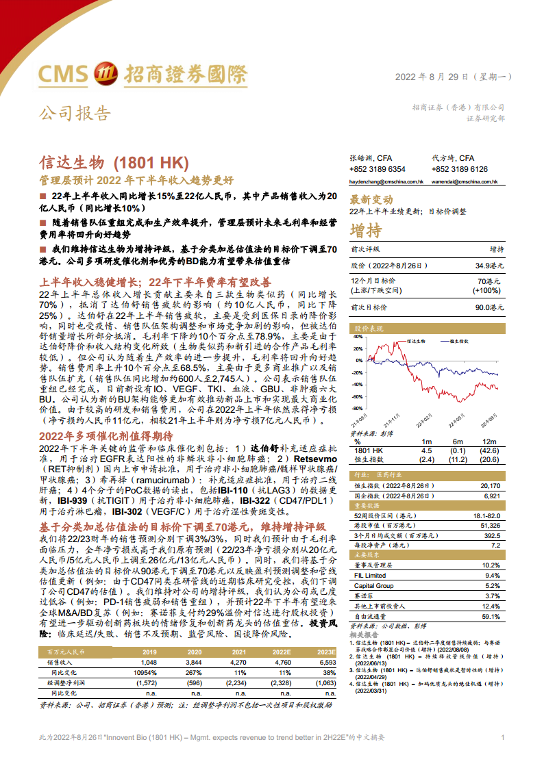 信达生物(01801):管理层预计2022年下半年收入趋势更好