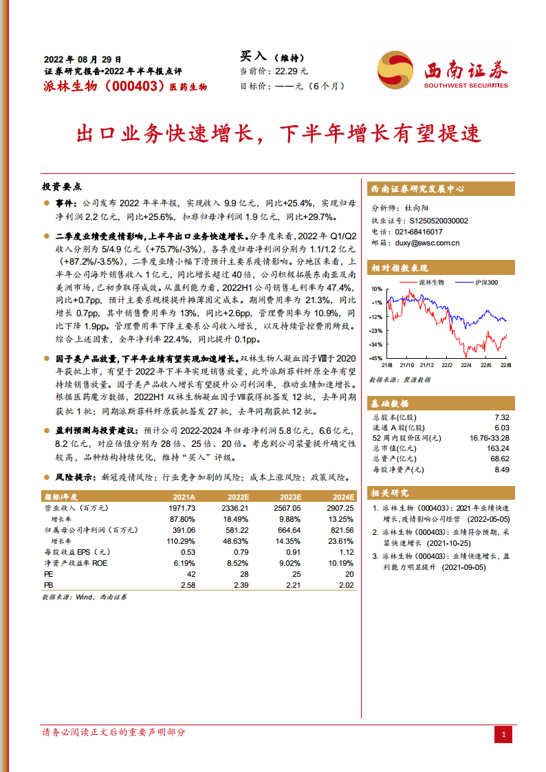 派林生物(000403):出口业务快速增长,下半年增长有望提速