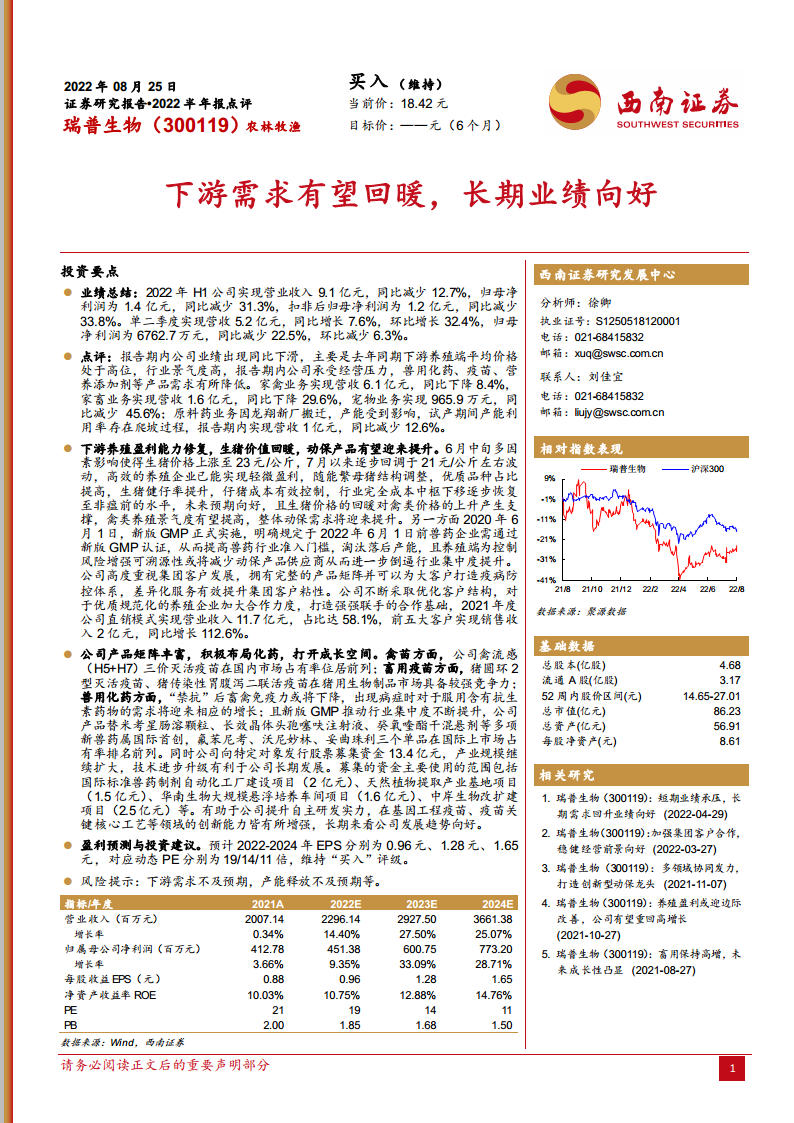 瑞普生物(300119):下游需求有望回暖,长期业绩向好