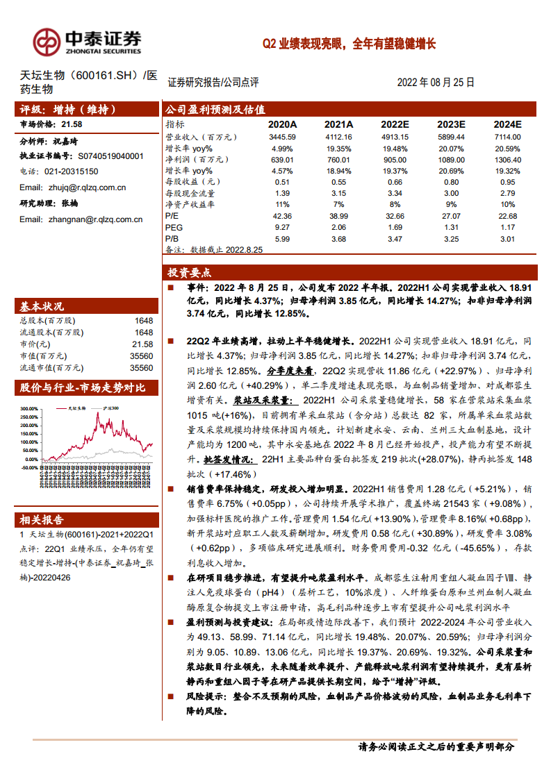 天坛生物(600161):Q2业绩表现亮眼,全年有望稳健增长