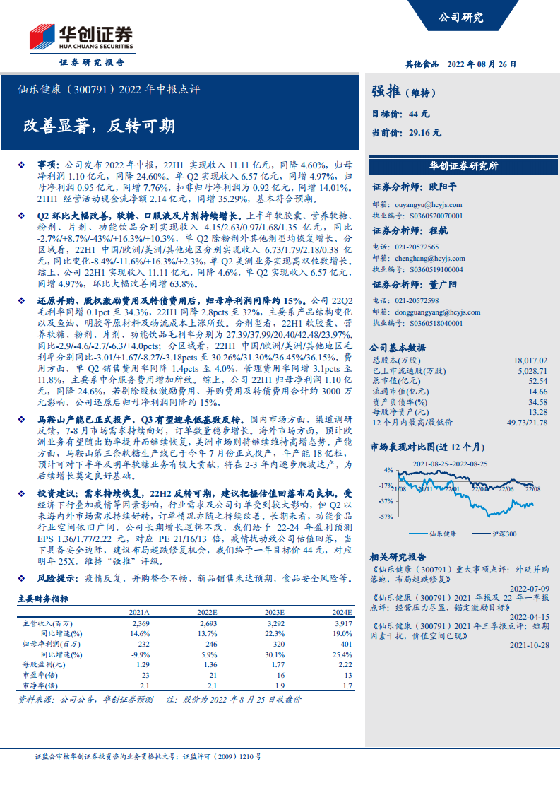 仙乐健康(300791)2022年中报点评:改善显著,反转可期