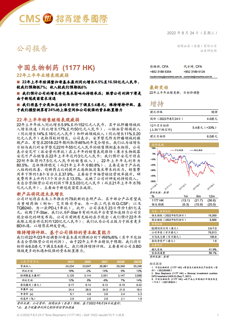 中国生物制药(01177):22年上半年业绩表现疲弱