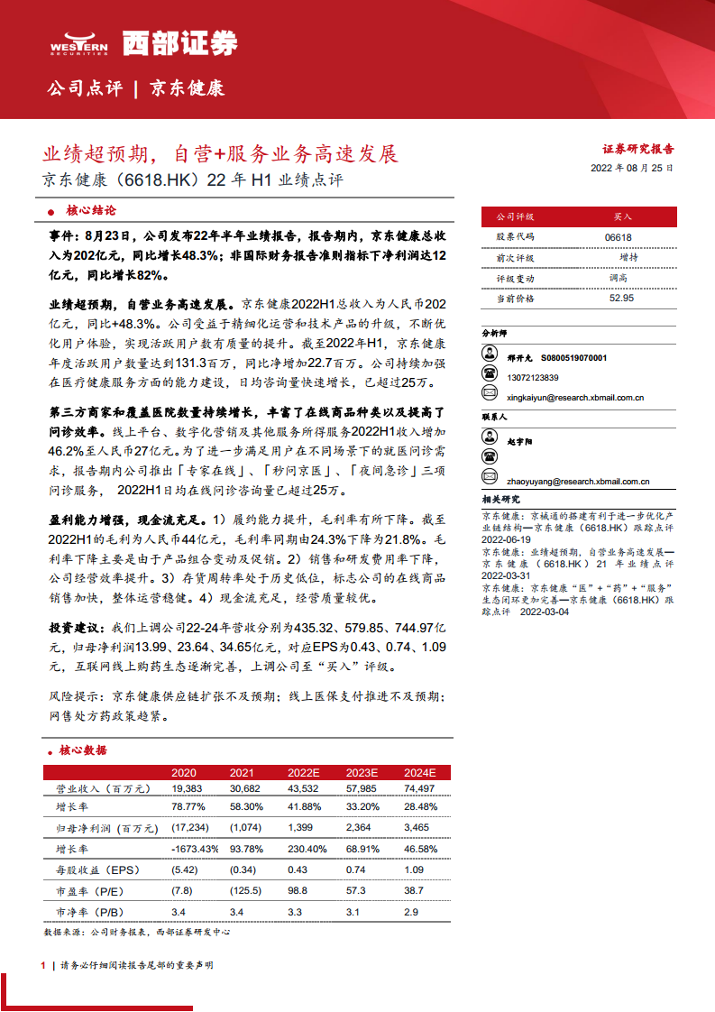 京东健康(06618)22年H1业绩点评:业绩超预期,自营+服务业务高速发展