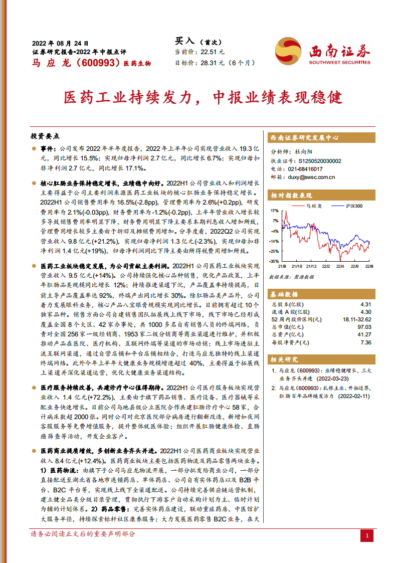 马应龙(600993):医药工业持续发力,中报业绩表现稳健