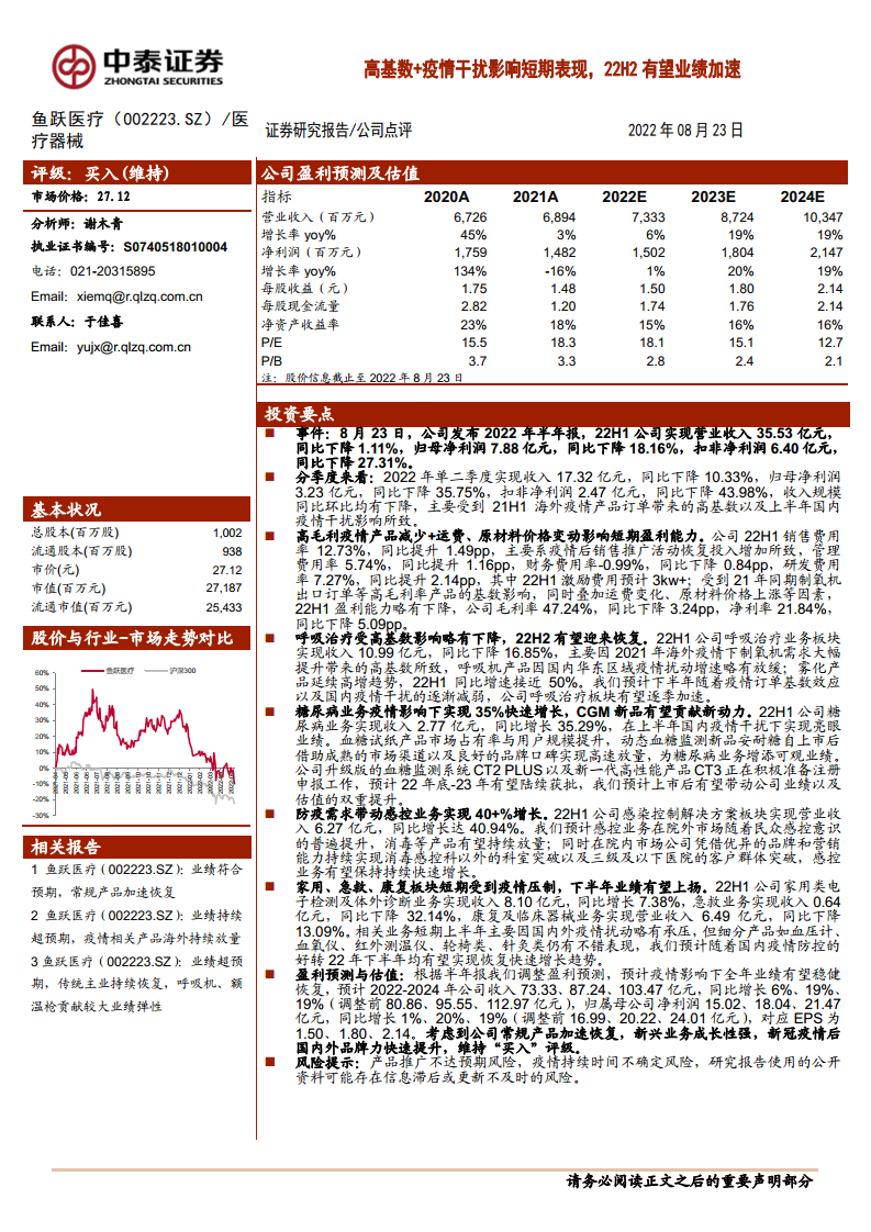 鱼跃医疗(002223):高基数+疫情干扰影响短期表现,22H2有望业绩加速