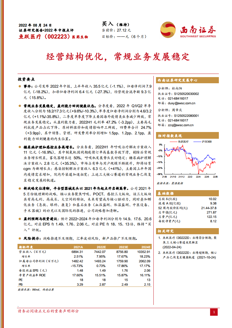 鱼跃医疗(002223):经营结构优化,常规业务发展稳定